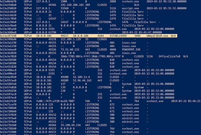 In this question, you need to find the outgoing connection from “UWkpjFjDzM.exe”. I used the same plugin as in the previous question, but this time I focused on the “ForeignAddr” column.