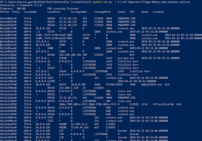 To answer this question, you can use several plugins. I chose the “windows.netscan” plugin. In the slightly shifted “LocalAddr” column, you can find the IP address associated with this memory dump.