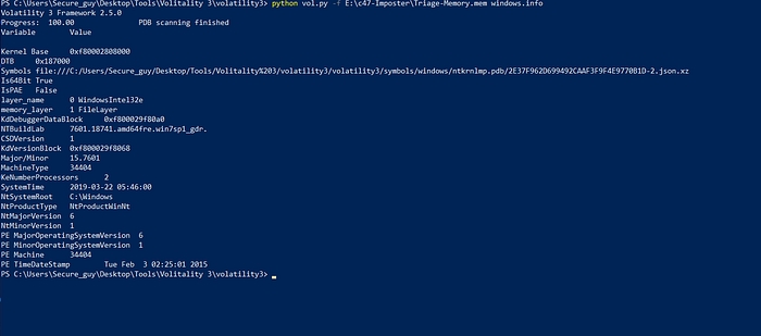 This question might be a bit tricky if you’re using Volatility 3. Due to the fact that Volatility 3 doesn’t necessarily require profiles to work, I took some liberties with the rules. First, I used the “windows.info” plugin to display information about the memory image.