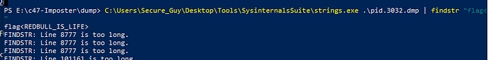 python vol.py -f C:\path\to\dump -o C:\where\to\dump windows.memmap --dump --pid 3032Then, using the “strings” program from the Sysinternals Suite (which can be downloaded from https://learn.microsoft.com/en-us/sysinternals/downloads/sysinternals-suite), I searched for the string “flag<” which was given as a hint for the answer. The flag is “flag<REDBULL_IS_LIFE>”.