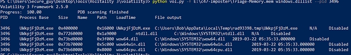 When the scan was successful, in the “NTBuildLab” row, you can see “win7sp1,” which is the equivalent of a profile in Volatility 2. Now, you just need to add the system architecture to get the answer. Ultimately, I found that the plugin you would use with Volatility 3 is “Win7SP1x64.”