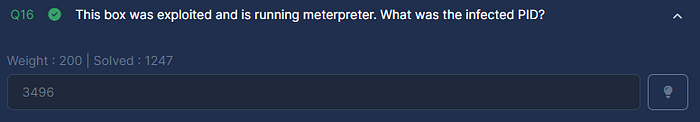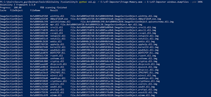 This question is much more challenging than the others, but with a clever approach, it can be solved. Using the command below, I managed to dump all files with PID 3496, including the process we’re looking for.