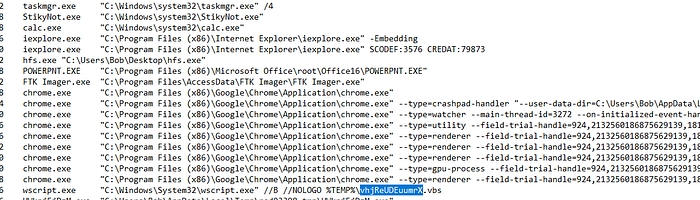 To list the process tree, you should use the “windows.pstree” plugin and locate the parent process “wscript.exe.” You’ll see that directly underneath it, there’s a suspicious process named “UWkpjFjDzM.exe.”