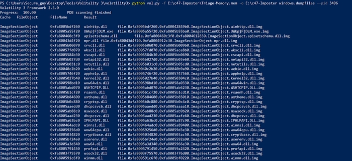 python vol.py -f C:\Path\To\Chalange\File -o C:\Output\path\for\dump windows.dumpfiles --pid 3496