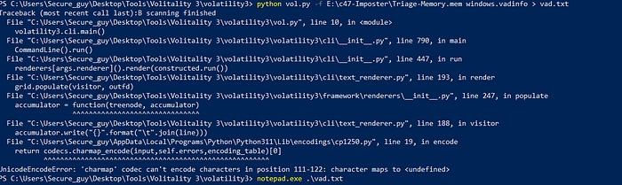 To answer this question, I used the windows.vadinfo plugin. Due to the extensive output, I redirected it to a file named "vad.txt" and then opened it in Notepad. Despite encountering a few errors during the plugin execution, they didn't affect the accuracy of the answer I found.