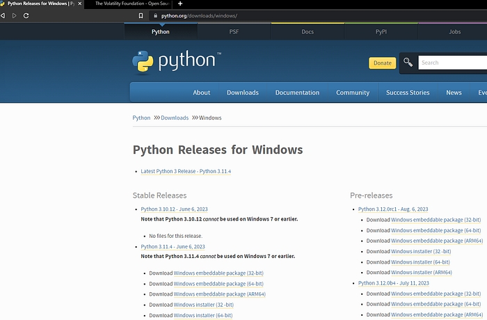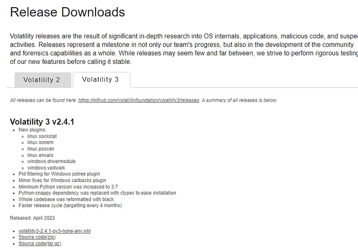 I’ll be installing Volatility 3 on Windows, and you can download it from the official Volatility Foundation website, where you’ll find the download link for the program. Additionally, for Volatility to work smoothly, you’ll need Python 3.